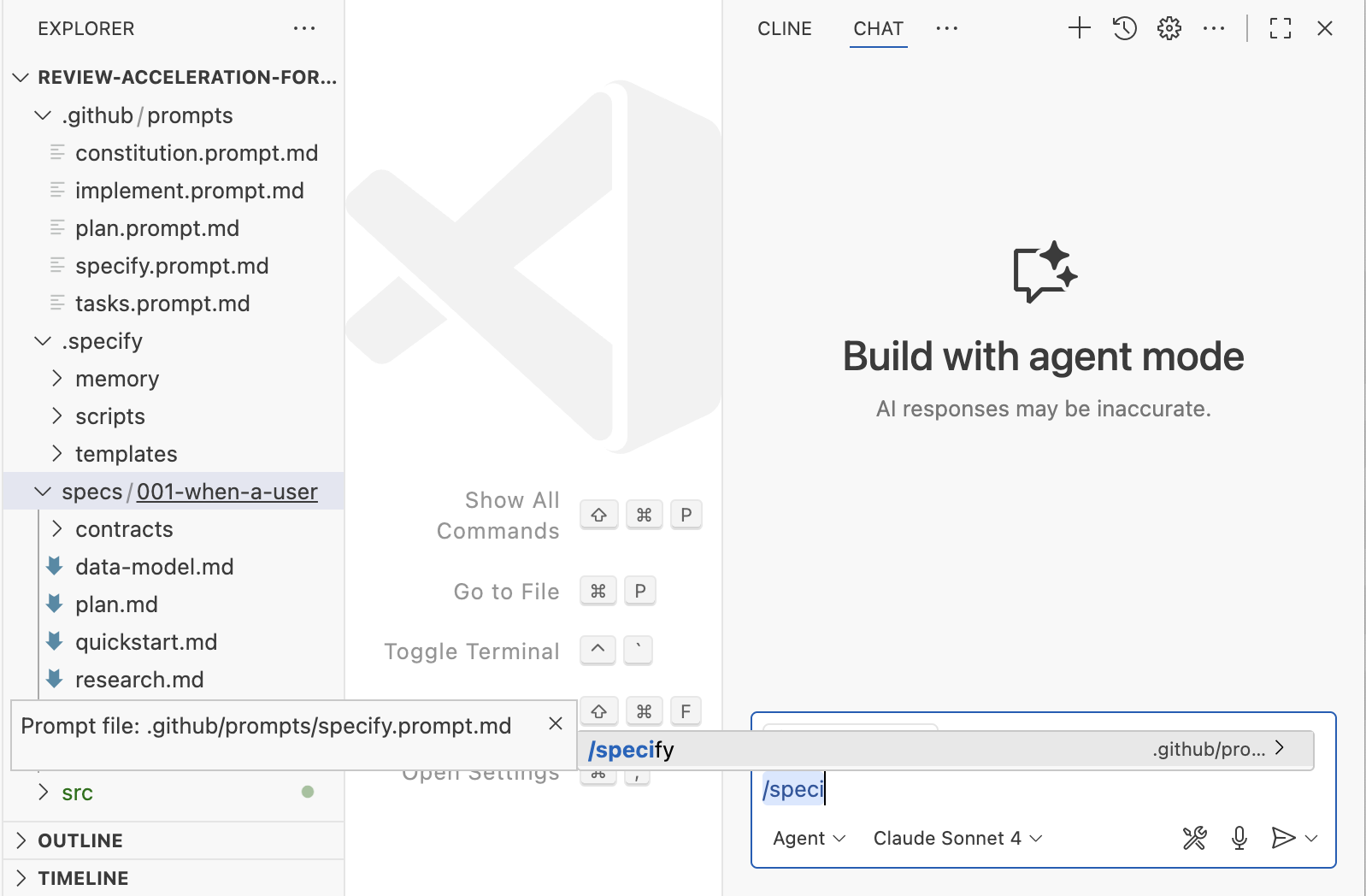 Spec-kit — это версия SDD от GitHub. Он распространяется как CLI, который умеет создавать структуру workspace для широкого спектра популярных coding assistants. После настройки этой структуры вы взаимодействуете со spec-kit через slash-команды в своем ассистенте. Поскольку все его артефакты размещаются прямо в workspace, это самый кастомизируемый из трех инструментов, о которых здесь идет речь.